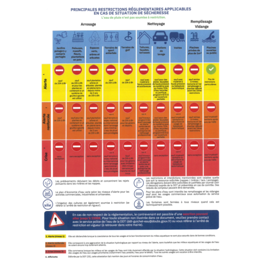 Aucune restriction d'eau n'a été mise en place, le département reste en vigilance et incite les particuliers à adopter des gestes d'économie d'eau.